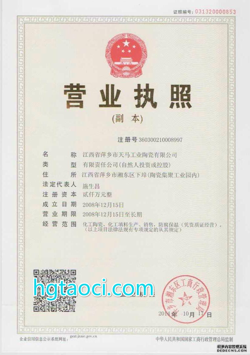 證件經(jīng)營范圍:化工陶瓷、化工填料生產(chǎn)、銷售、防腐保溫。