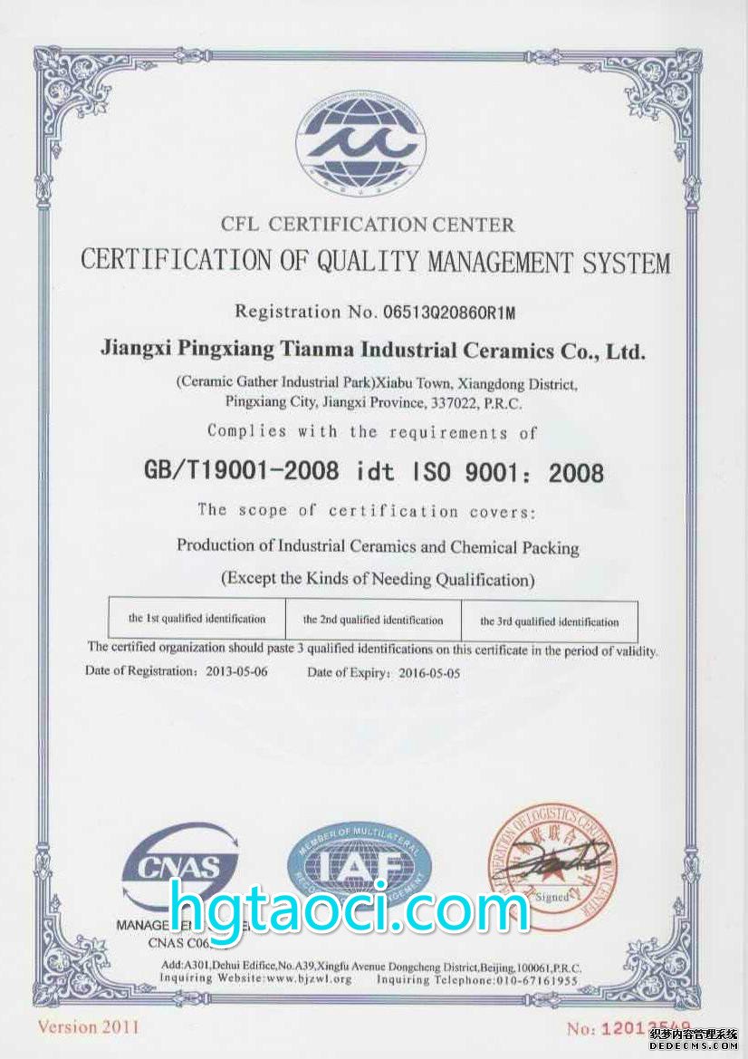 證書覆蓋范圍:工業(yè)陶瓷、化工填料的生產(chǎn)。